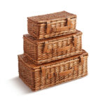 Βαλίτσα Μπαμπού Βαλίτσες μπαμπού σετ 3 τεμαχίων. Οι βαλίτσες έχουν σταθερή πλέξη από καλάμια μπαμπού, είναι σε χρώμα καφέ και στα κλείνουν με δερμάτινους ιμάντες.