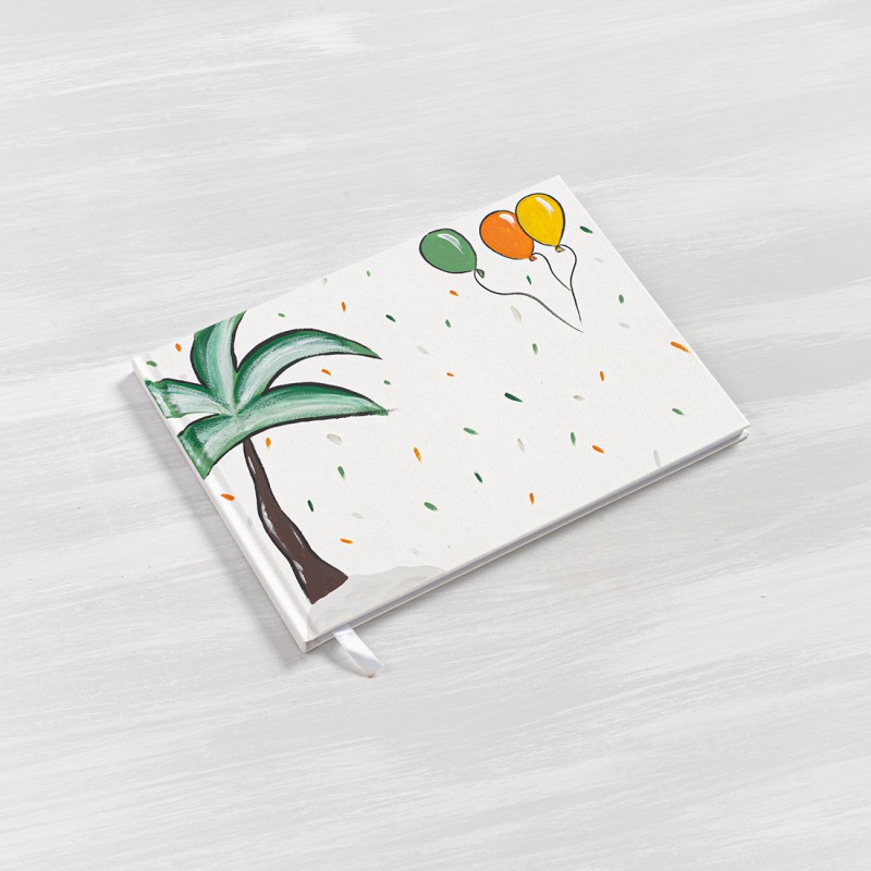 Βιβλίο ευχών με εξώφυλλο από χοντρό χαρτόνι σε λευκό χρώμα, ζωγραφισμένο με φοίνικα και μπαλόνια.