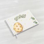 Βιβλίο ευχών με εξώφυλλο από χοντρό χαρτόνι σε λευκό χρώμα, ζωγραφισμένο με αυγό και πατουσάκια δεινόσαυρου.