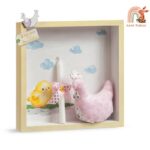 Ξύλινη πασχαλινή κορνίζα σετ δώρου με θέμα Η μικρή φάρμα με την ροζ κοτούλα. Στο σετ περιλαμβάνεται η πασχαλινή λαμπάδα