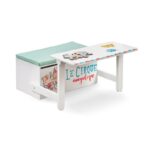 Le cirque magnifique. Ξύλινο κουτί βαπτιστικών παγκάκι-θρανίο με βεραμάν μαξιλάρι. Το κουτί είναι βαμμένο σε λευκό χρώμα. Στην πλάτη είναι ζωγραφισμένο το καπέλο του μάγου. Στο παγκάκι υπάρχουν δύο ξύλινες παραστάσεις με ζωάκια να κάνουν διάφορα ακροβατικά.