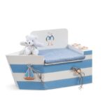 Ocean blue. Ξύλινο κουτί βαπτιστικών καθισματάκι σε σχήμα καραβιού. Το καράβι είναι βαμμένο σε ριγέ μπλε χρώμα. Στην πλάτη είναι ζωγραφισμένος ένας γλάρος και υπάρχουν διάσπαρτα διάφορα διακοσμητικά ναυτικά στοιχεία. Το μαξιλάρι είναι με ύφασμα σε σιέλ χρώμα.