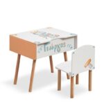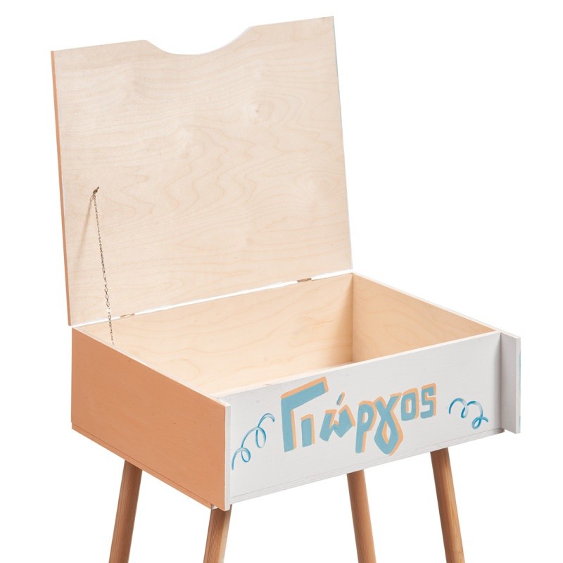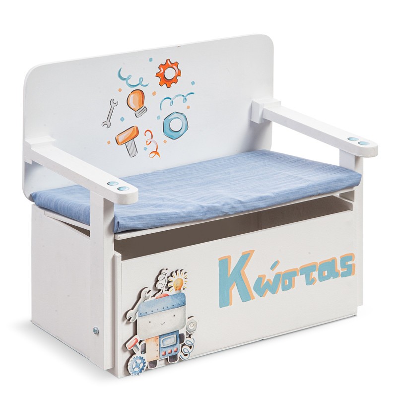 Robots rule. Ξύλινο κουτί βαπτιστικών θρανίο με καρεκλάκι. Το κουτί είναι βαμμένο σε λευκό και πορτοκαλί χρώμα. Στο επάνω μέρος είναι ζωγραφισμένο ένα ρομπότ και στο μπροστινό μέρος το όνομα του παιδιού.