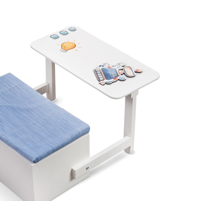 Robots rule. Ξύλινο κουτί βαπτιστικών παγκάκι- θρανίο με σιέλ μαξιλάρι. Το κουτί είναι βαμμένο σε λευκό. Στο επάνω μέρος είναι ζωγραφισμένα διάφορα εργαλεία και στο μπροστινό μέρος υπάρχει ξύλινη παράσταση ρομπότ και το όνομα του παιδιού.