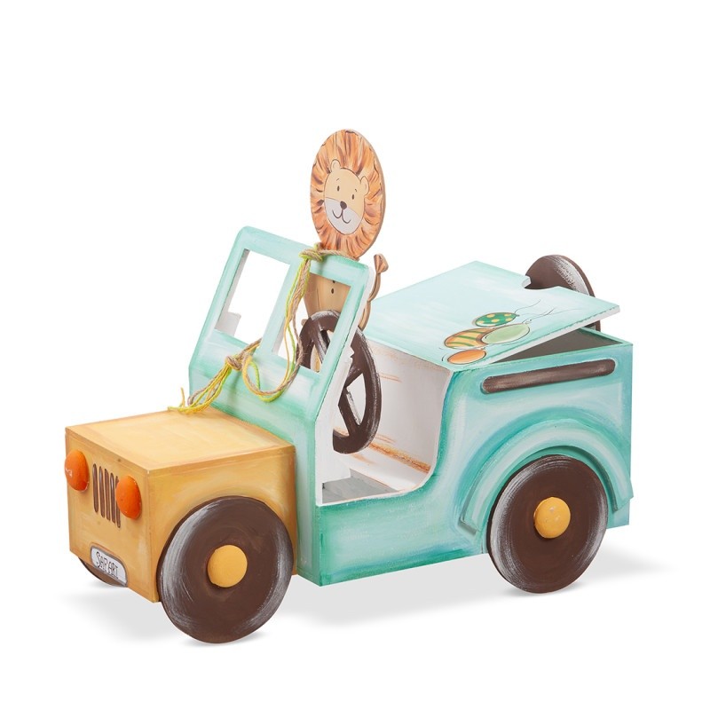 SAFARI ADVENTURE. Ξύλινο κουτί βάπτισης σε σχήμα κύβου. Ο κύβος είναι βαμμένος σε πράσινες & κίτρινες αποχρώσεις. Το μπροστινό μέρος είναι διακοσμημένο με ξύλινη παράσταση που απεικονίζει τα ζώα της ζούγκλας να πηγαίνουν για σαφάρι και με ζωγραφιστούς φοίνικες. Ο λινός κίτρινος φιόγκος με τα φύλλα στο επάνω μέρος ολοκληρώνει το κουτί με θέμα τα safari animals.