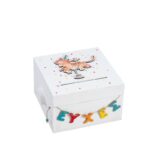 Ξύλινο τετράγωνο κουτί ευχών σε λευκό χρώμα. Οι λέξη “ευχές” είναι βαμμένες πολύχρωμες. Στο επάνω μέρος υπάρχει ξύλινη παράσταση με την τίγρη να κάνει ακροβατικά.